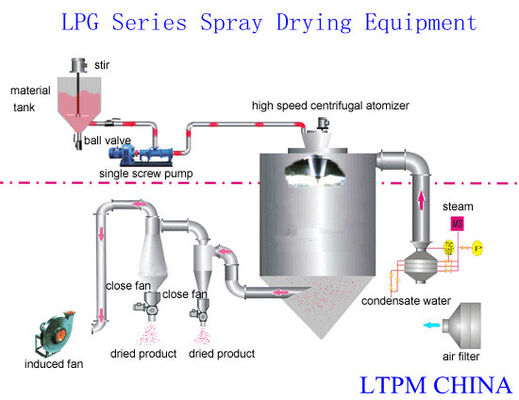 El aire está a través del filtro y del calentador, el distribuidor del aire que incorpora el top del dedicator, el aire caliente toma la forma de espiral y entra en el dedicator uniformemente. El líquido material, del canal líquido material del en desacuerdo con la comunidad o el atomizador de la dirección para el top del dedicator de la bomba que envía a través del filtro, hace el chorro líquido material hacia fuera en un flujo del descenso calorífico extremadamente pequeño, del líquido material y del aire caliente y permanece en contacto, humedad para evaporarse rápidamente, dentro extremadamente del breve periodo de tiempo seco convertirse en producto final, descarga del producto final por la parte inferior seca de la torre y el separador del torbellino, el gas inútil es descargado por el ventilador.